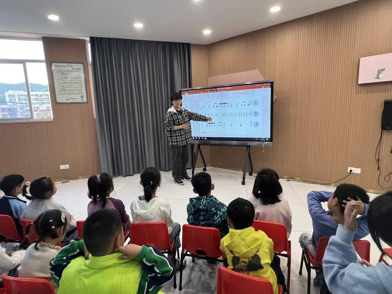 课程一改“校内理论+模拟授课”的传统模式,实行混编教学:学生先在大学课堂完成知识点拆解、教案设计与“无生试讲”,再到小学进行真实课堂观摩和片段教学实践。此次出征的20名同学提前两周打磨“微教案”——音符认知、节奏游戏、旋律模唱,每人3-5分钟片段教学;海沧青少年宫指导教师先用5分钟示范课堂组织技巧,随后“小老师”依次登台,课堂气氛热烈。