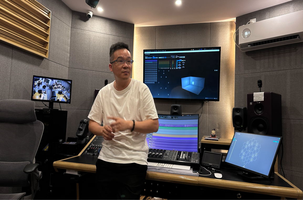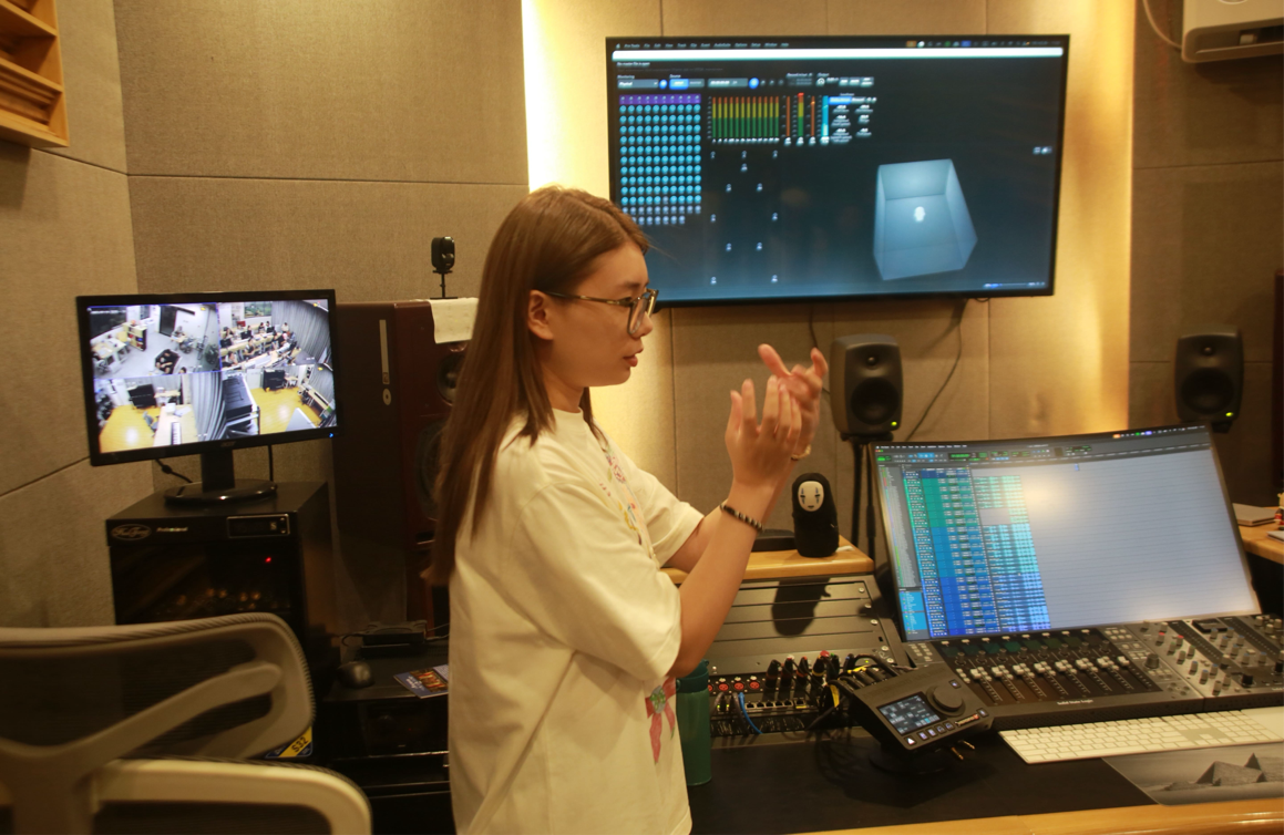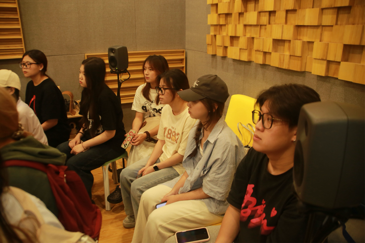 活动中,师生在专业混音教室沉浸式体验音乐,通过尖端音频设备近距离感受现代音乐制作技术的发展成果。孙屹老师、郑思玥老师分别为师生解开单声道、杜比全景声与立体音响技术的奥秘,从声学原理到实际应用场景,系统解析不同技术对音乐表现力的影响,为“音乐+技术”的融合实践筑牢理论根基。