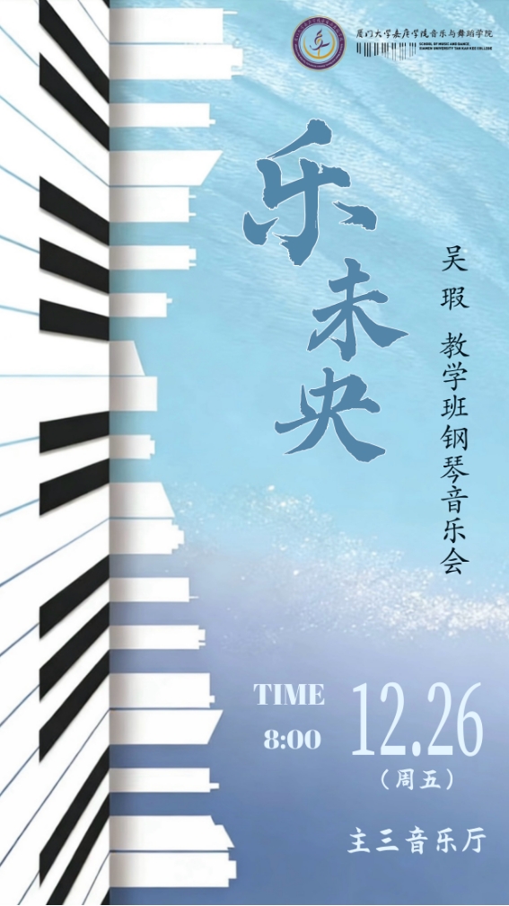 音乐会 名家名师进校园系列----李未明《和声的魅力与即兴的乐趣》 2025福建省高雅艺术进校园系列活动 热烈庆祝厦门大学嘉庚学院音乐与舞蹈学院成立 乐未央--吴瑕教学班钢琴音乐会 歌吟岁暖--吴蓁声乐课程班音乐会 视频影音 更多 新闻报道 更多 校地联手打造音乐剧,《梦语繁花》初绽芬芳 实践融合+全链管控 厦门大学嘉庚学院音乐与舞蹈学院创... 青春歌韵传经典 学子风采耀鹭岛 ——我院在厦门市青少... 厦门大学嘉庚学院音乐与舞蹈学院举办“一二九”党团知... 喜报!音乐与舞蹈学院原创肢体剧《坠落之前》双线夺奖... 对接国家特教提升计划,我校携手厦门特殊教育学校共筑... “嘉”讯!音乐与舞蹈学院揭牌成立 音乐系钢琴教研室实践周:在多元体验中读懂音乐的“立... 中共漳州市芗城区委宣传部赴厦门大学嘉庚学院开展林语... 音乐与舞蹈学院唱响《宪法伴我们成长》 压轴思明区“... 通知公告 更多 厦门大学嘉庚学院音乐与舞蹈学院毕业论文(设计)指导... 2025届毕业论文(设计)查重检测工作方案 音乐系毕业论文(设计)工作领导小组成员名单(2025年... 厦门大学嘉庚学院音乐系毕业论文(设计)指导手册 音乐系毕业论文(设计)格式参考文档 音乐系毕业论文(设计)工作领导小组成员名单 2024--2025学年第一学期教材选用计划表 厦门大学嘉庚学院音乐系首届五项全能大赛 厦门大学嘉庚学院音乐系舞蹈教研室“舞艺嘉庚杯”首届... 厦门大学嘉庚学院音乐系2024届毕业论文(设计)查重检... 风采之窗 更多 音乐与舞蹈学院 执行院长 廖瑞洁 厦门大学嘉庚学院18级舞蹈表演结业晚会 2018级民乐合奏汇报音乐会 赵纯 洪再添 胡乃君 相关链接 教务部 学校主页 厦门大学 厦门大学艺术学院 音乐系新浪微博